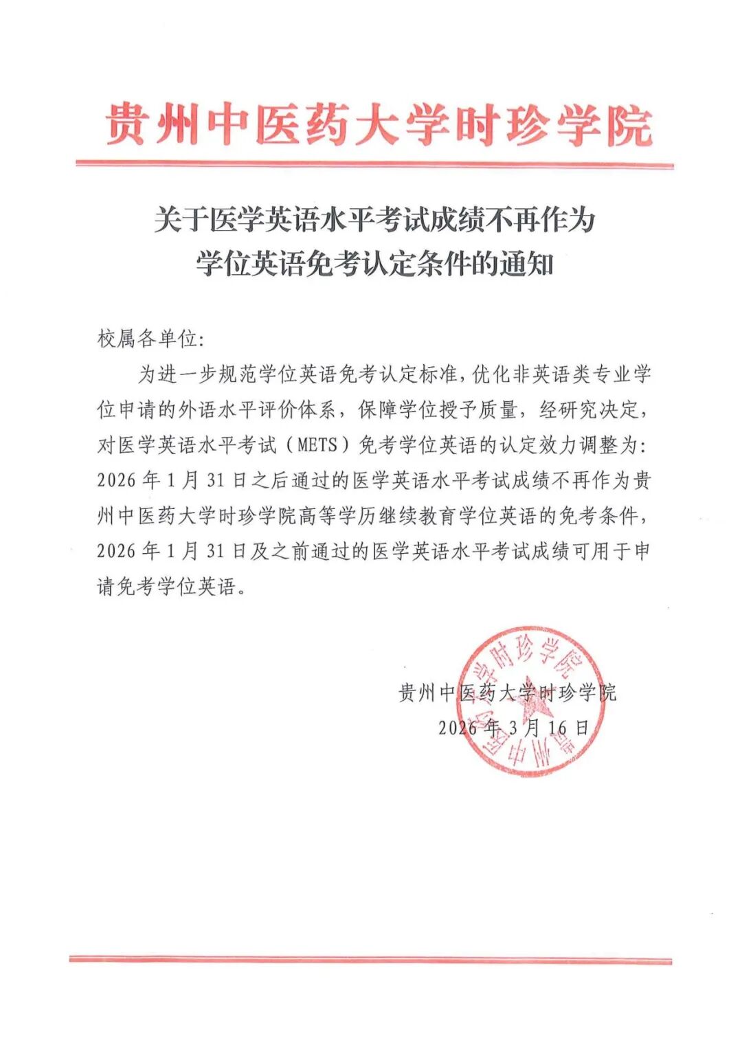 关于医学英语水平考试成绩不再作为学位英语免考认定条件的通知
